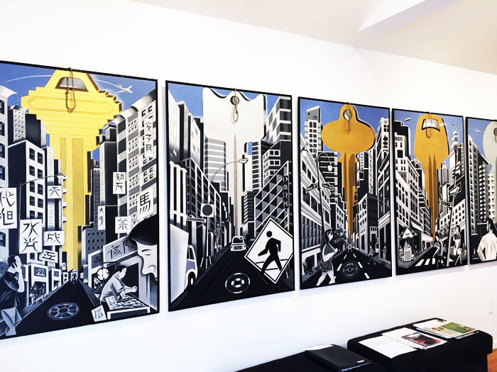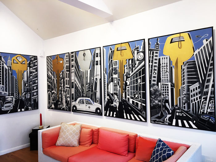 The Keys to the Cty, is a dynamic series of 12 panels depicting various neighborhoods around NYC, were visualized at age 13 during a bop into Manhattan, and painted at age 60.