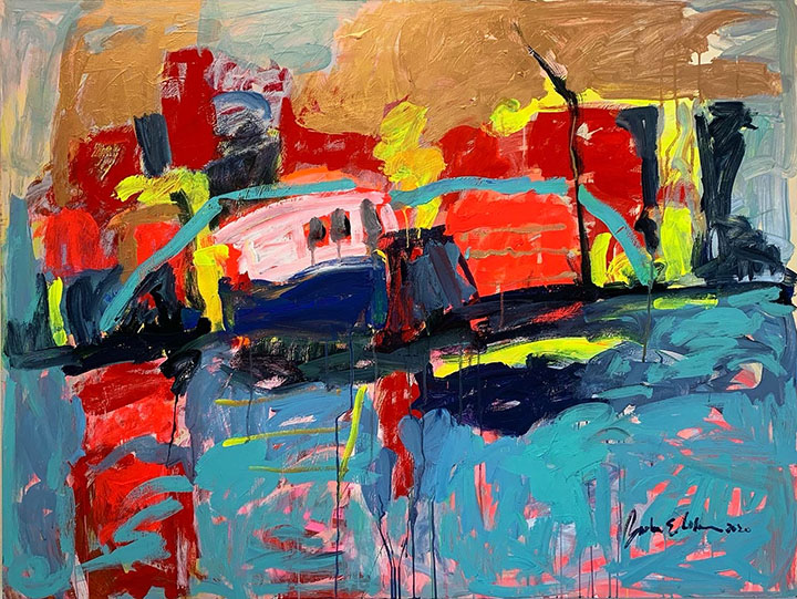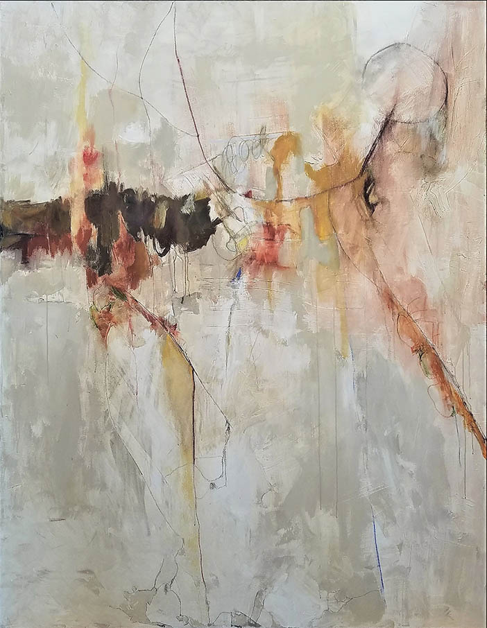 Her latest paintings on large canvases (72”x56”) incorporate oil, acrylic, charcoal, pastel, ink, fabric, and feathers. Graphic interconnecting lines suggest wires or strands symbolizing communication and the human struggle to stay connected.