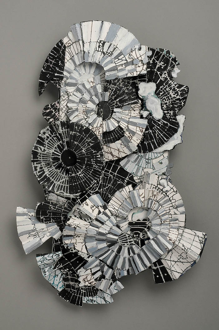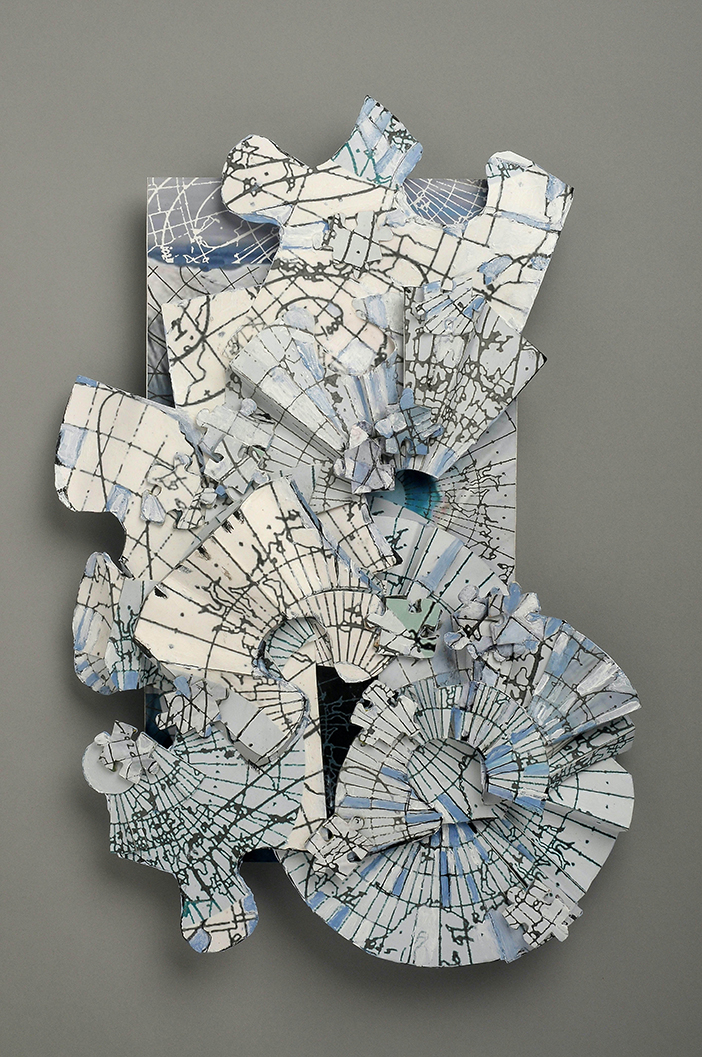 In the Deep, I find myself under the surface of the sea, where I wander among the mountains, valleys, and canyons of the ocean floor. Here, my palette has darkened, as has the mood reflecting the ecological dangers we face. Melting glaciers and warming seas have affected the sea floor itself. My imagery is drawn from maps of the ocean floor plotted in the 1950s and 1960s by geologist Marie Tharp. I scan sections, alter them in Photoshop, print them digitally, then cut and reassemble the fragments with added paint, to form an imagined dimensional underwater topography Layers are attached with magnets, reflecting the magnetic energy of the earth’s tectonic plates. The depth and texture in these works are both illusion and actual."