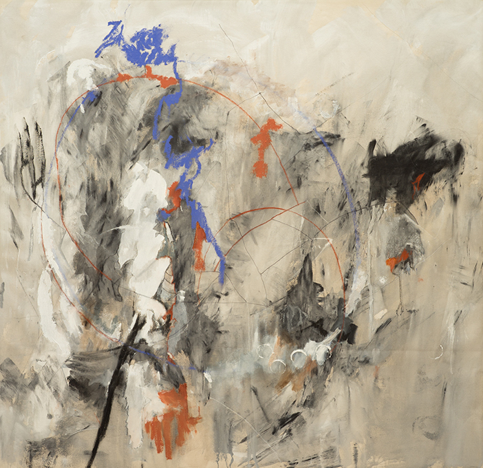 I use spackling tools to lay the first surface, with the unstretched raw canvas laid out on the studio floor. I gesso the canvas adding glazes while still wet. When this dries I stretch the canvas and continue to work on it upright against the wall. I draw and paint using brushes, charcoal, pastels, rubbing, scraping, repainting, redrawing until I begin to find my voice. There is a lot of looking also.