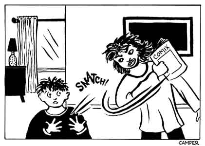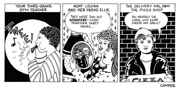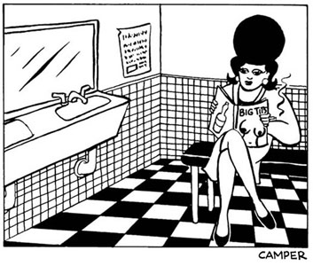 Jennifer Camper's comics explore gender, race and class from an outsider's (female, queer, and mongrel) perspective. The work also celebrates sexy women and ridicules stupidity. Camper became a cartoonist because she likes making art with both words and pictures. Also, all the tools of the trade are small and easy to shoplift.
