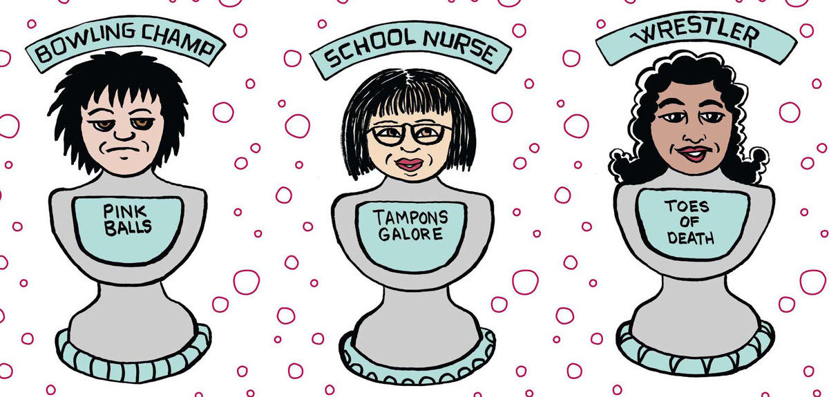 Her books include Rude Girls and Dangerous Women, a collection of her cartoons, and subGURLZ, a graphic novella about three twisted women living in abandoned subway tunnels. Camper is also the founding editor of two Juicy Mother comix anthologies. She edited the Queer Pin-Ups playing cards and is the creator/coordinator of the Queers & Comics Conference, CLAGS, CUNY Grad Center, NYC, 2015.
