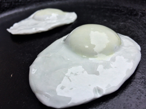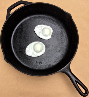 “Over Hard” is two porcelain eggs in an iron skillet. The two eggs are part of a larger installation. The installation includes hundreds of eggs, in stacks, and in individual form like the ones presented.