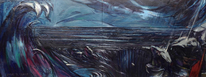 The largest painting in this exhibit is a marine nocturne. It began as a calm, glassy sea reflecting the moon, however it has become a raging storm, like war, whose power is utterly overwhelming.”