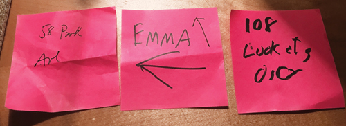 “I write poems but these are writing too. These are addresses and measure things and remind me to do things that I do sometimes, and other times the note sticks around so long it’s embarrassing. They are sort of a family of messages on post-its, index cards, torn corners of legal paper (yellow) and envelopes too. It’s a thing. I’m volunteering to bring my materials to the gallery for short periods of time during the run of the show to write a note for you, or record a regret.”