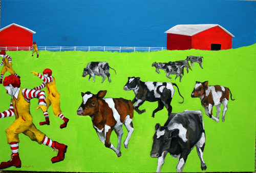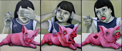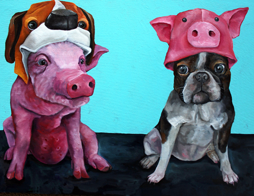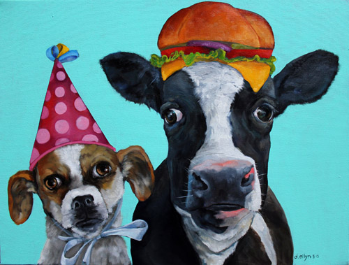 Dana Ellyn is a full-time painter living and working in Washington DC. She has been a vegetarian at heart since childhood, in practice since 2002 and a vegan since 2013. This evolution has had a tremendous influence on the paintings she creates. After a shy and quiet childhood and young adulthood, Ellyn has now found her voice and is making up for lost time. She creates hard-hitting paintings that have stories to tell and opinions to express. Her animal-themed paintings strike a chord, creatively posing the question: why do we love some animals and eat others?