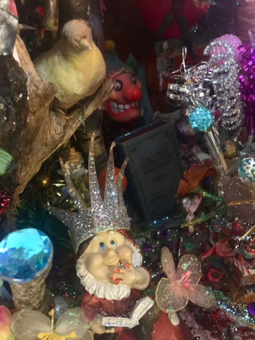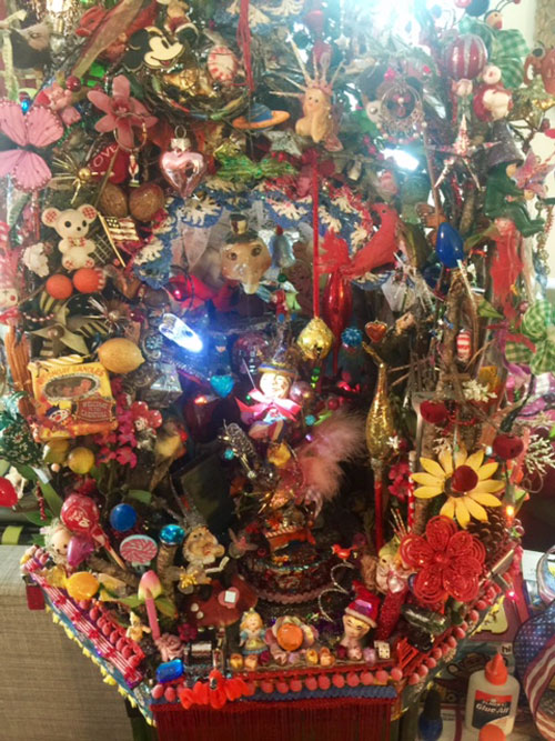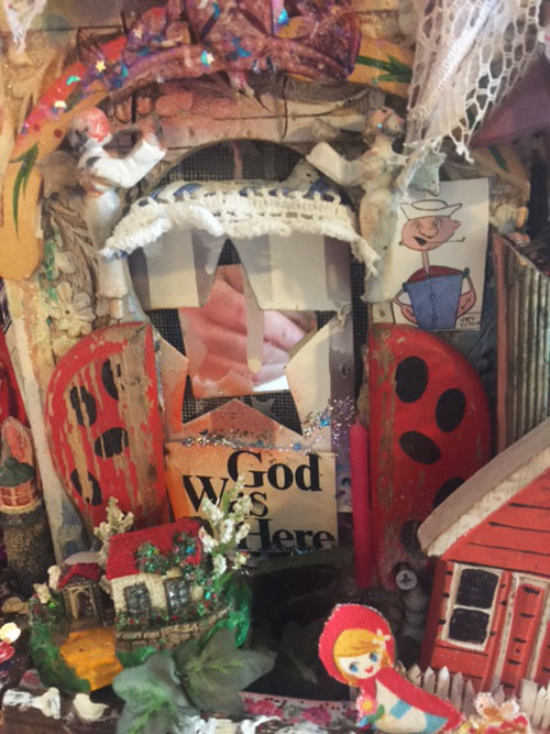 I chose the second part of this title because it is interactively musical which you see in the video (but keep in mind there are other little surprises but I didn’t want to give it all away!), and I used “dis-assemblage” because there’s a chaos within its presentation, however there is also a divine order within as well...is it coming together or falling apart? I always want my whimsical pieces of art to have the sensibility of a broken children’s toy someone found in their grandmother’s attic, and this piece encapsulates this is spades. The cupola is dissected and when turned 180 degrees one sees the proscenium arch as in the theater and inside is an enchanting musical scene. At the heart of the scene is a real disco ball dripping in wax, nail polish and lipstick. The cupola itself is capped off with an elvish woman in an elegant red dress holding a crystal ball and having broken mirror pieces for wings. Antlers are construed from delicate tree branches.”