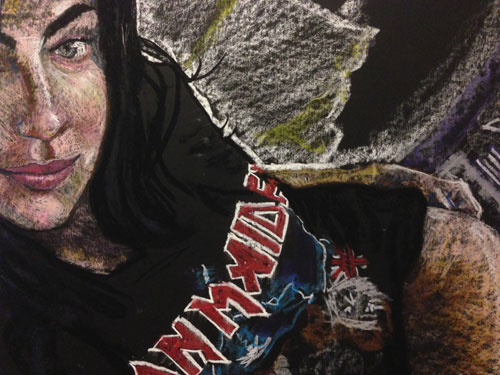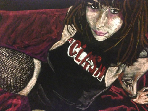 Katrina del Mar, known primarily as a photographer and filmmaker, returns to her roots as a visual artist with this show, making drawings on black paper and paintings on black velvet. In this playful conversation with negative space in a positive light; an exploration of extremes occurs. Keeping a foot planted firmly in pop culture and kitsch, in line with her gang girl B-Movie world and fantastic, intentionally half-realized pulp fiction paperbacks of 2013, the work utilizes a layering of media, in effect a echoic, distorted, amplified mirroring. These black paper drawings and black velvet paintings depict hard-femme selfies, parties in cars, women in heavy metal or punk t-shirts. An obsessive, participatory exploration into the potentiality of feminist expression. Citing the oft-repeated photographers complaint that “everybody is a photographer,” these works formulate a push against and answer to the instantaneously made and shared photos of the digital age. The implied mirror or screen, a disrupted transmissive surface for exploring known and newly discovered selves via queer selfie drawings and filmed portraits, challenge accepted norms of representation.