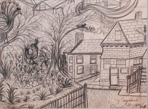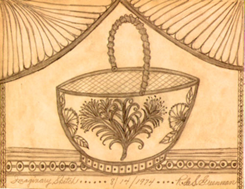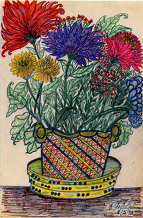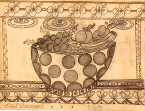 In the mid 1970's deSmith Greenman was diagnosed with Altzheimer's Disease. From 1970 to 1977, while struggling with the disease, she produced a staggering number of drawings. Spending most hours alone, she drew obsessively. Working with pencils, pens, crayons, and markers, deSmith Greenman interpreted the world of her imagination. Other favorite subjects included vases of flowers, fruit bowls, and television sets broadcasting invented programs. Her images frequently involve transformations; a familiar table or paper weight will often reappear with a new identity.