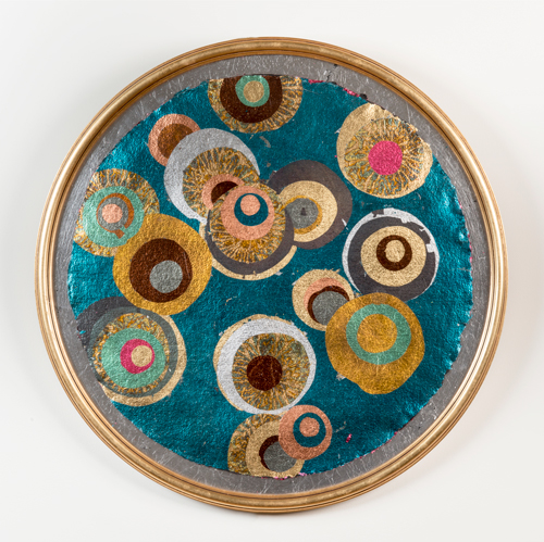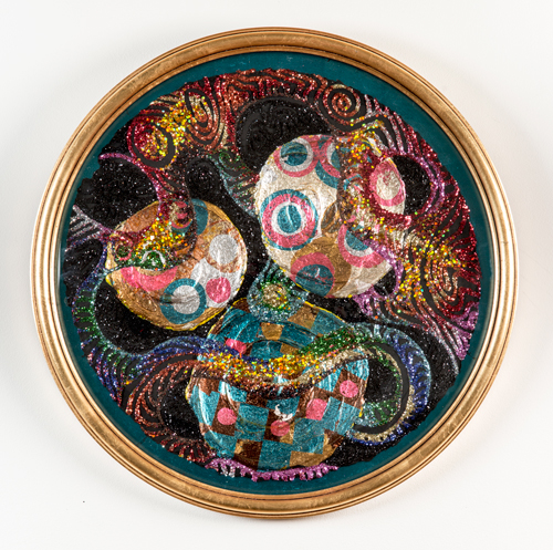 “I get my inspiration from many places — light and sparkle, longing, The Golden Age of Hollywood, films, glamour, gay history, burlesque history, war, and seduction are all very close to me. I love to find the beauty in the grotesque, the light in the dark, order in chaos, and to share that experience with my audience. I enjoy having a constant dialog with my art, both physically and mentally. When passing in front of one of my glitter pieces, the light continues to move and change bringing new vitality to the work while also keeping my environment alive.