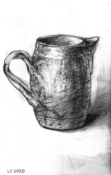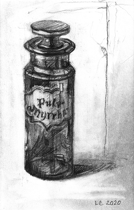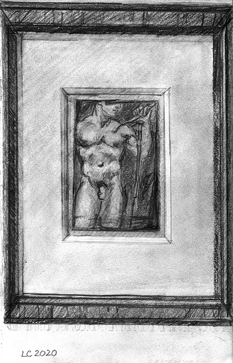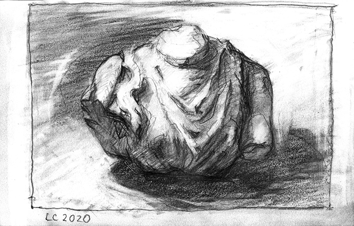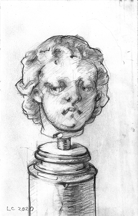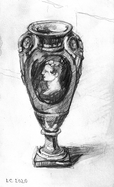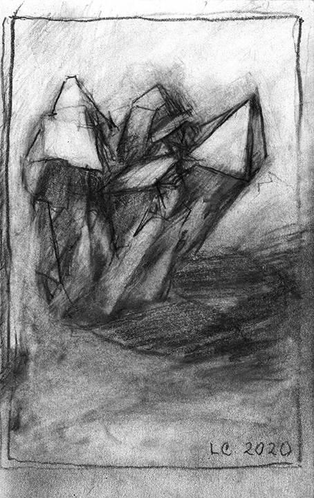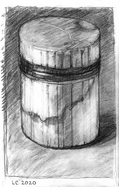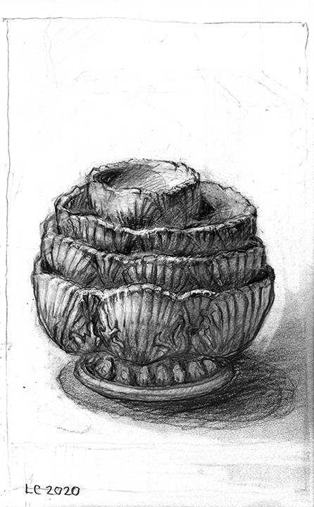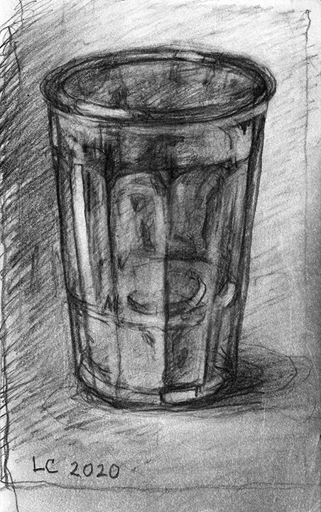 He [Larry Collins] didn’t decide in advance which of his possessions he was going to draw; there were no hierarchies in terms of utilitarian objects versus some of the fine art or antiques he’s collected over the years. Nothing was chosen for its symbolic or sentimental associations. Why spend days drawing the glass of water, but not the toothbrush? Why draw the Christmas cactus, but not the fin de siècle Egyptian Revival stained glass lamp? He drew each thing as if he was seeing it for the first time; in isolation, all he saw was form, volume, light and shadow. He wouldn’t pick the next object until the previous drawing was completed. Then he would scan the room, waiting for the next thing to “jump out at me.”